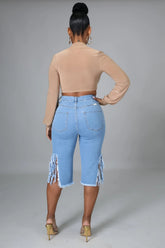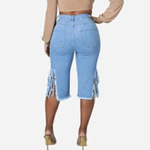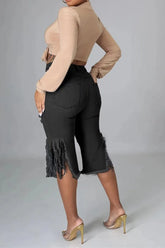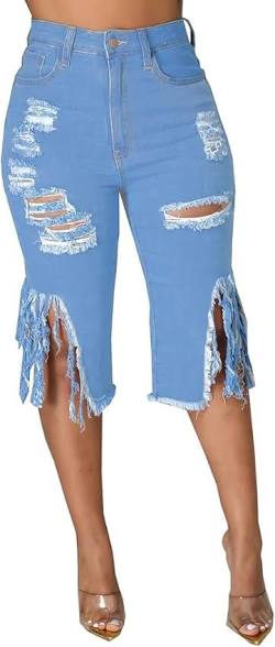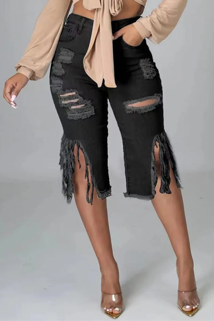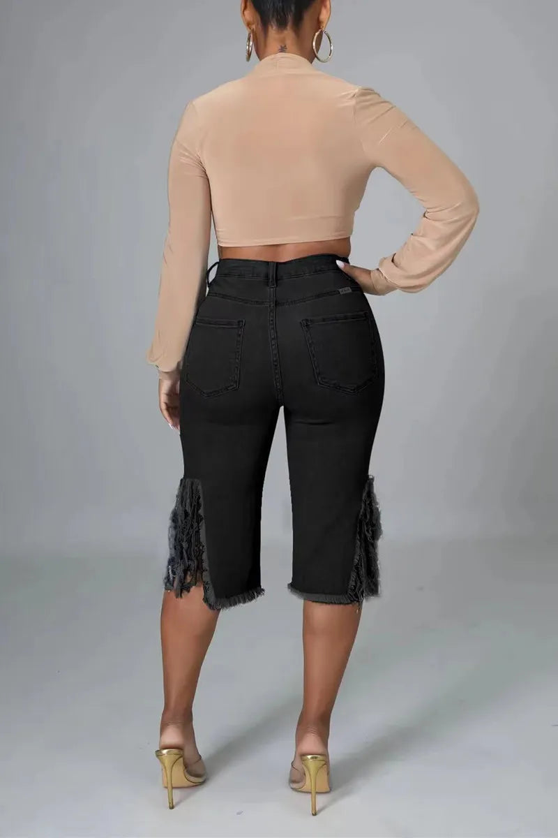 High-Rise Distressed Denim Bermuda Shorts with Fringe Hem