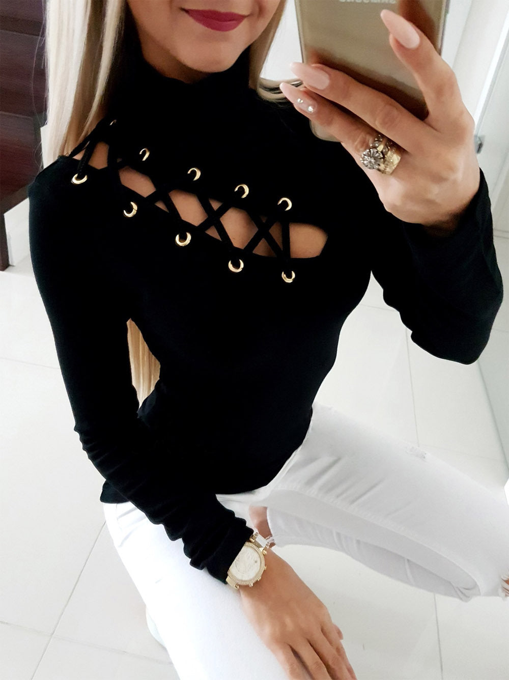 Women s Elegant Ribbed Knit Lace-Up Long Sleeve Top – Mock Neck Cut-Out Eyelet Blouse